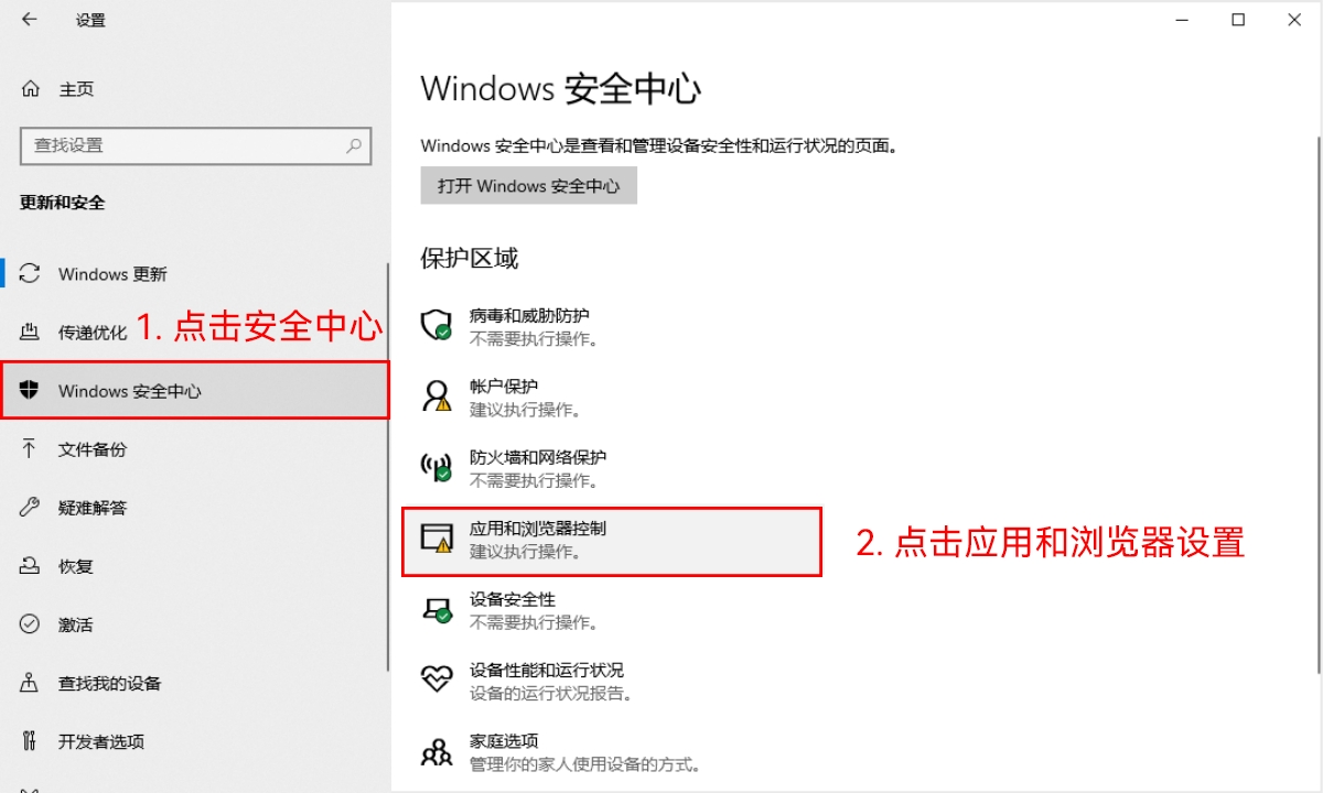 4. 进入“Windows安全中心“,点击”应用和浏览器控制“