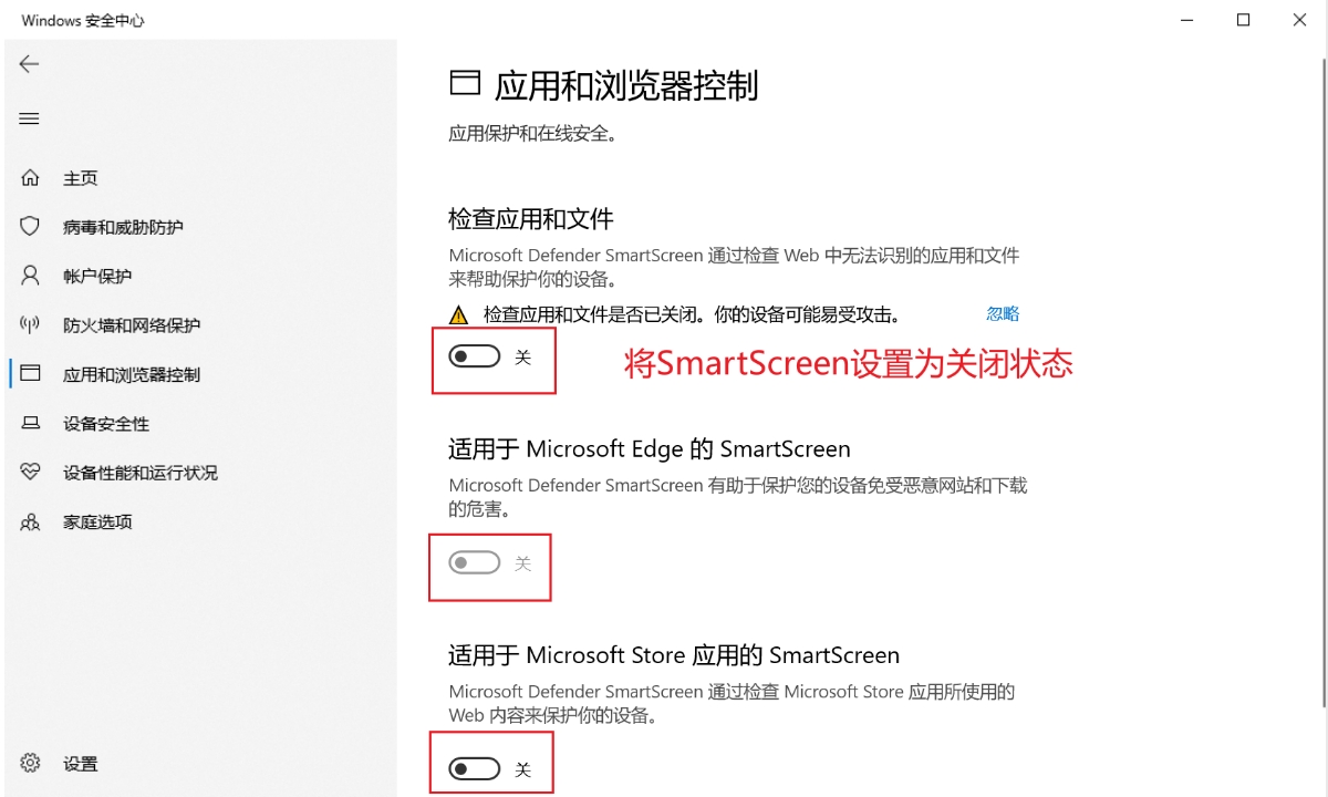5. 将3个”SmartScreen“全部设置为关闭状态